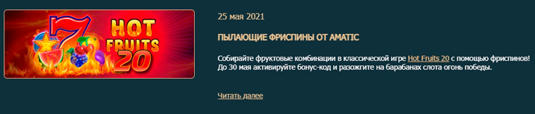 - Бонус-код HOT20 — 20 фриспинов по ставке 20 рублей за депозит на сумму от 1 600 RUB.